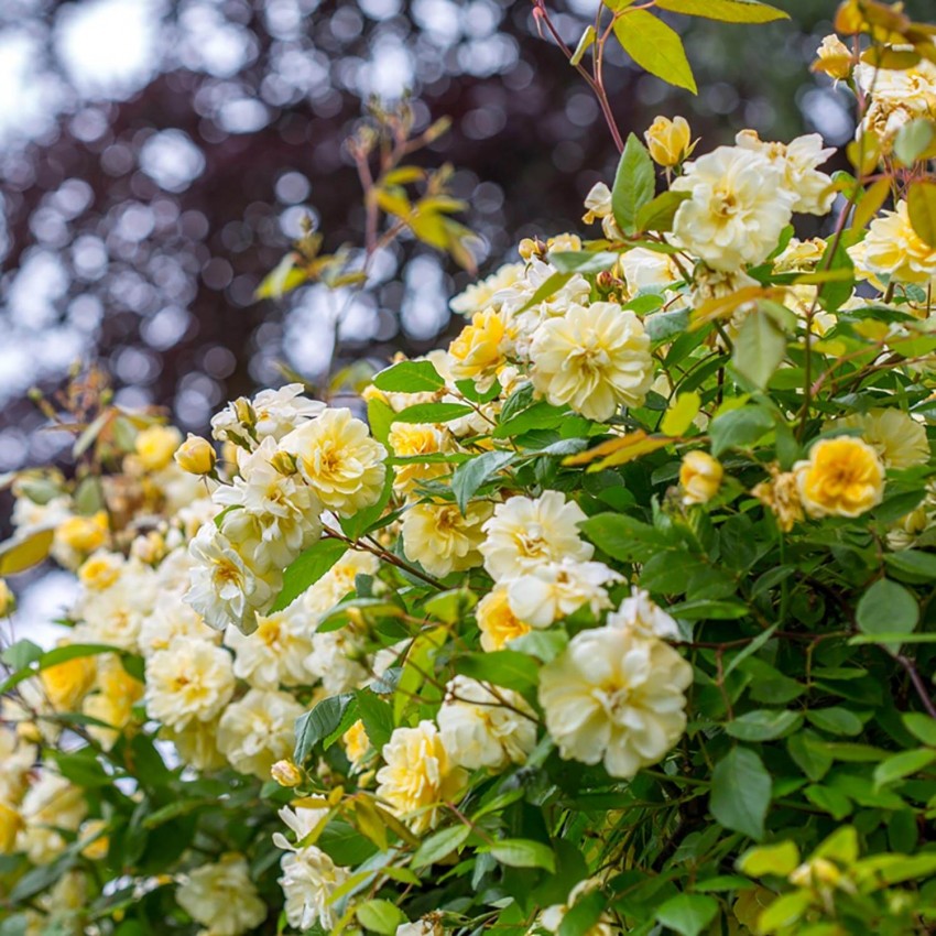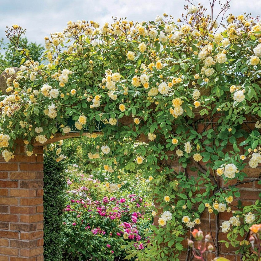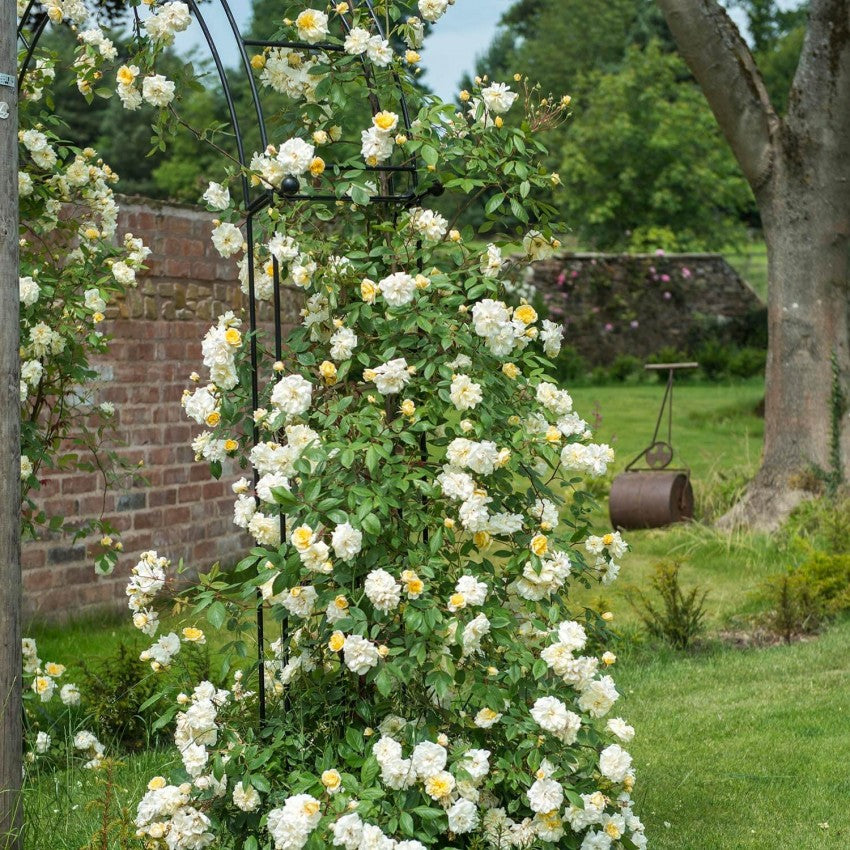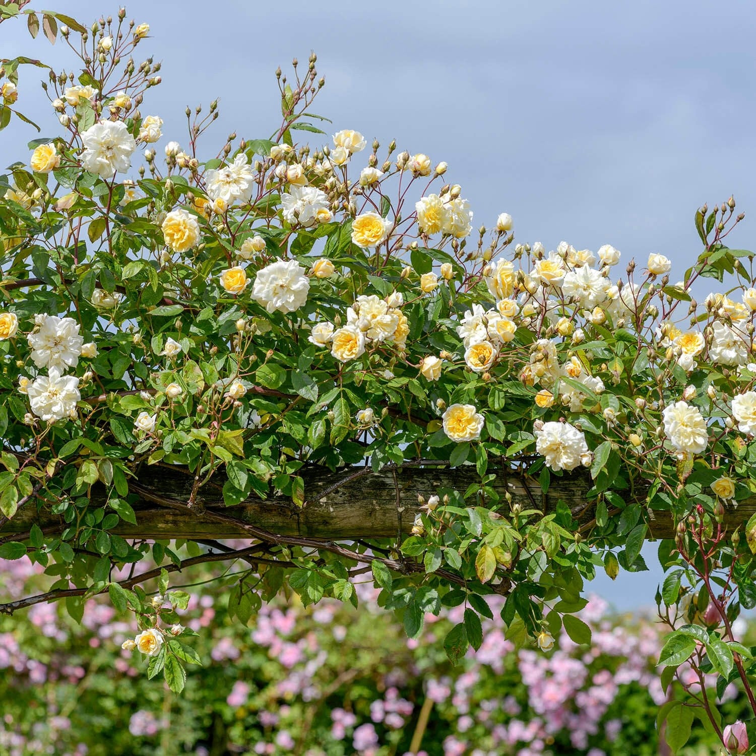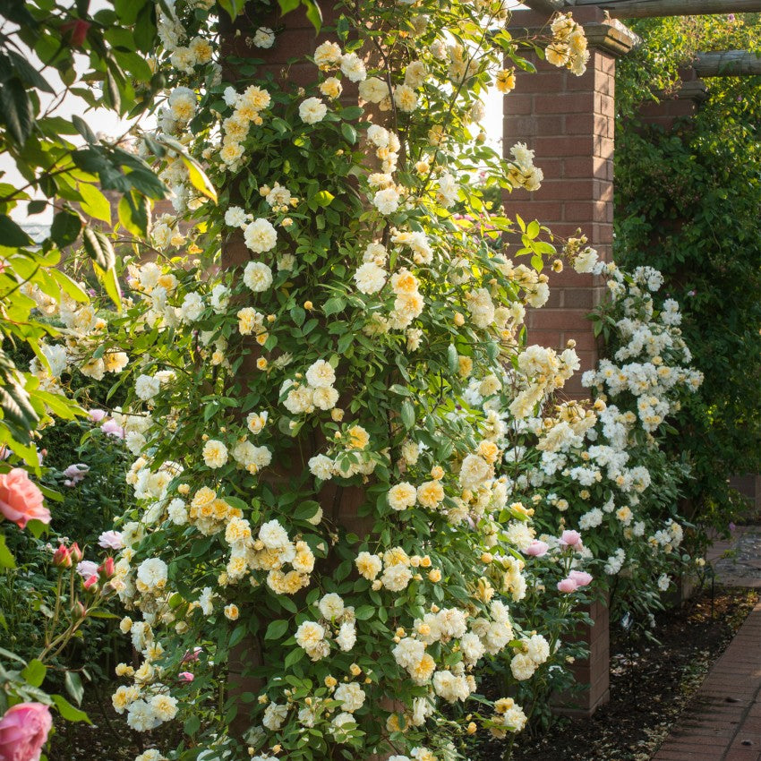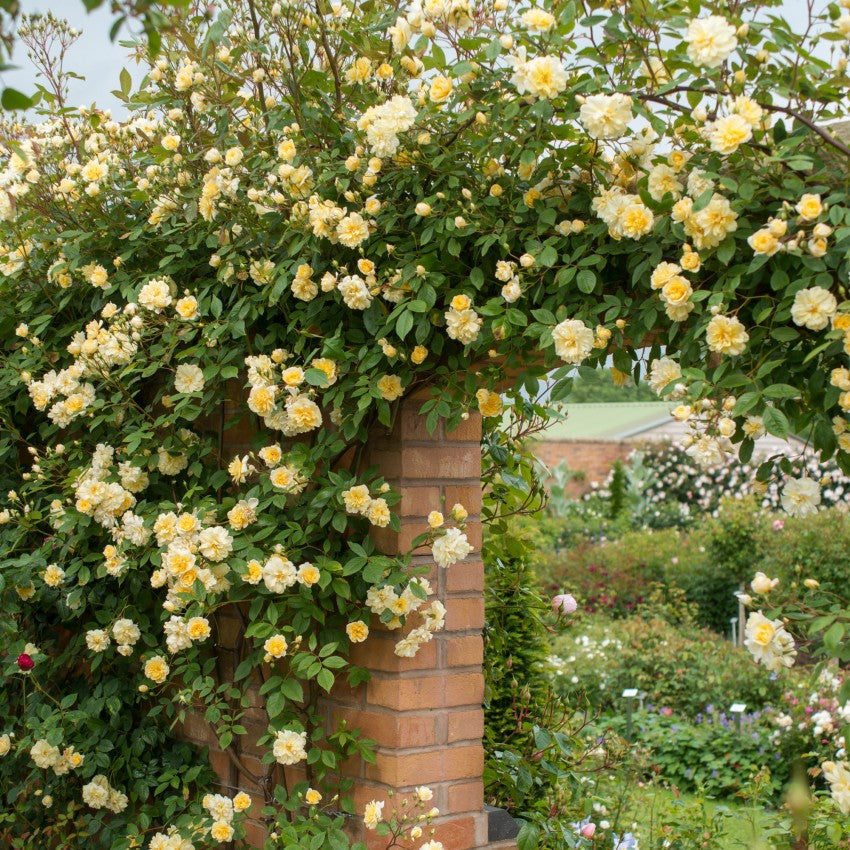 繰り返し咲く、珍しいランブラーです。中程度から大きいかたまりで、可愛らしいソフトイエローの花が咲きます。成長は強く、スレンダーに伸び、葉は照り葉でとげも少ない。アーチを簡単に覆うことができ、壁面や、トレリスなら3~4m程度には伸びます。明るいノワゼット・ローズの香りがあります。 |