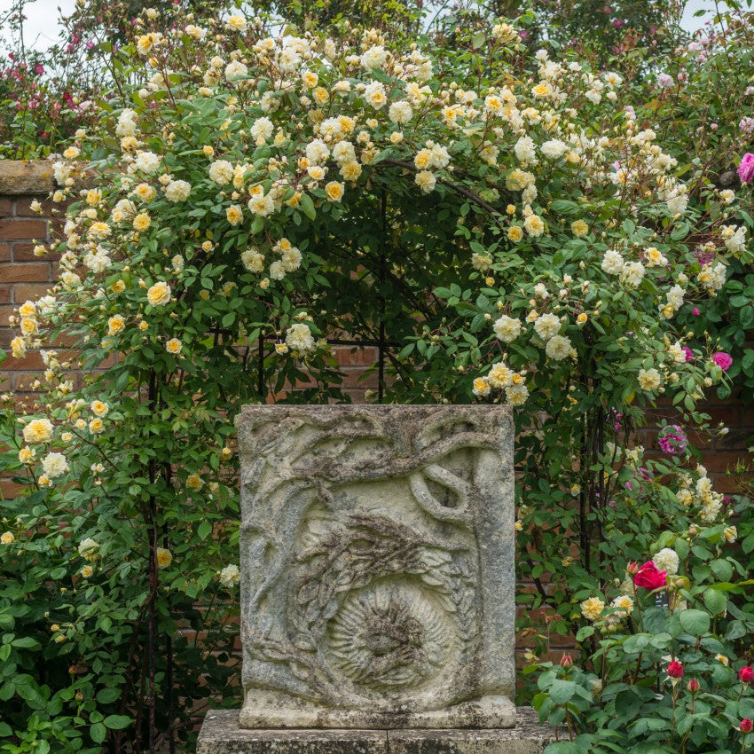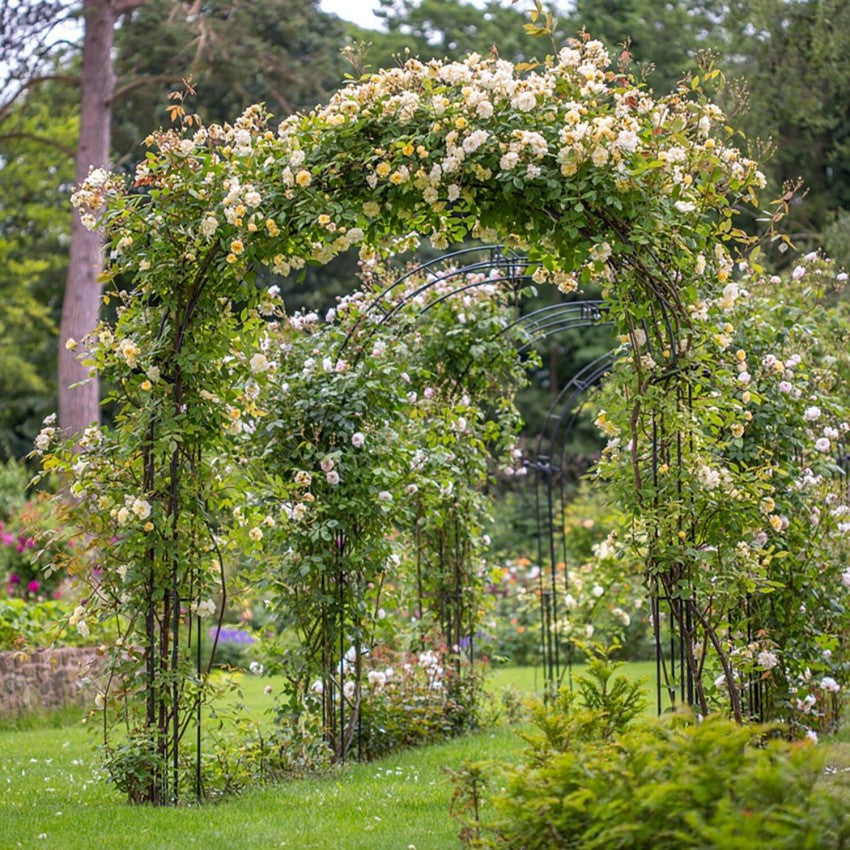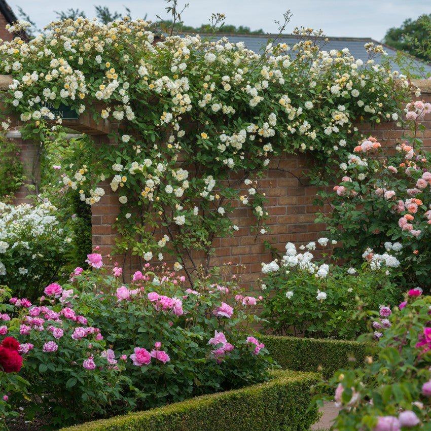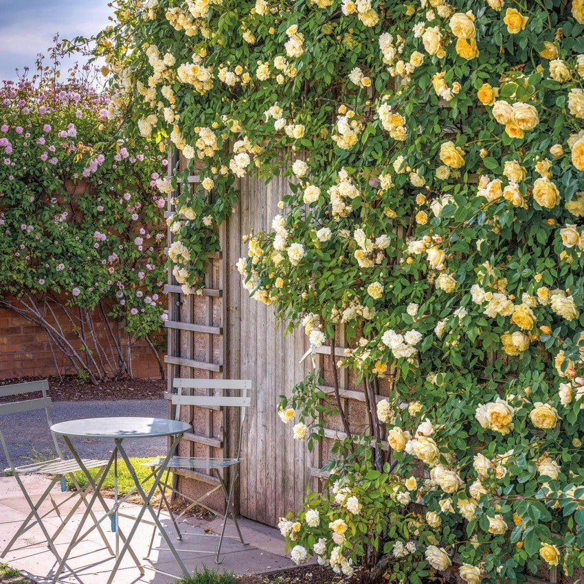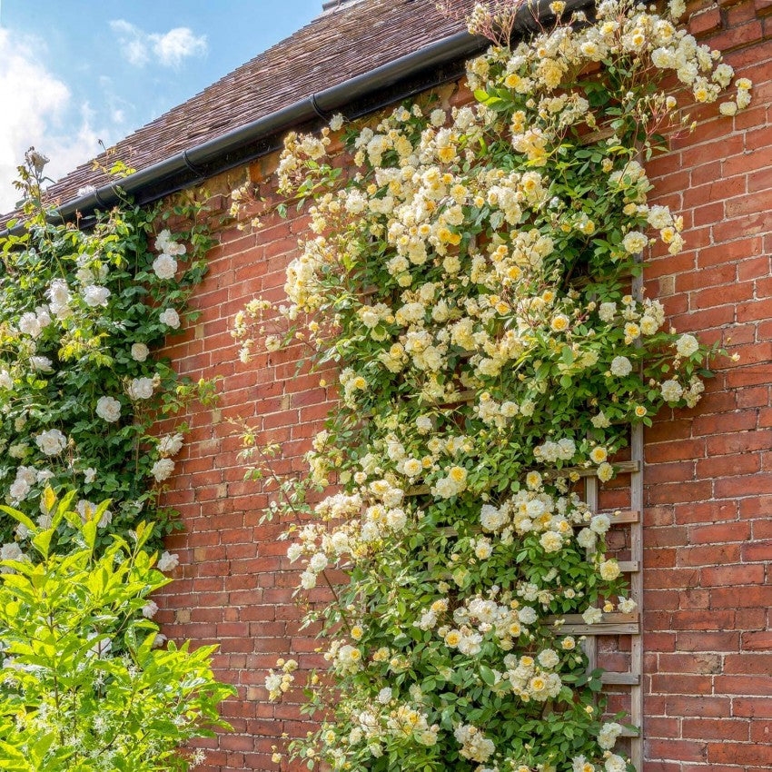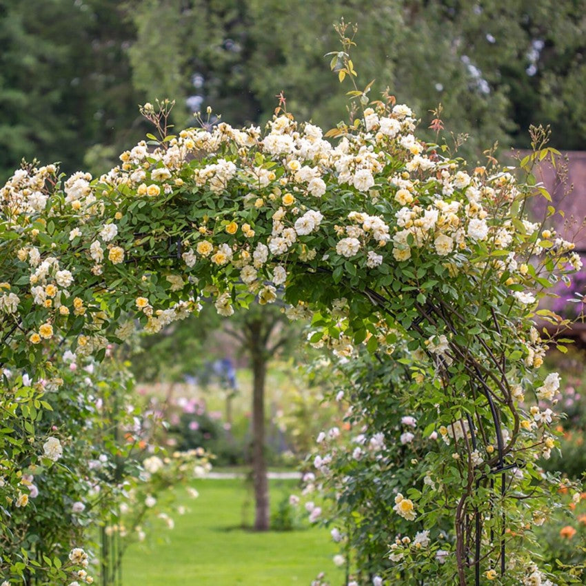 繰り返し咲く、珍しいランブラーです。中程度から大きいかたまりで、可愛らしいソフトイエローの花が咲きます。成長は強く、スレンダーに伸び、葉は照り葉でとげも少ない。アーチを簡単に覆うことができ、壁面や、トレリスなら3~4m程度には伸びます。明るいノワゼット・ローズの香りがあります。 |