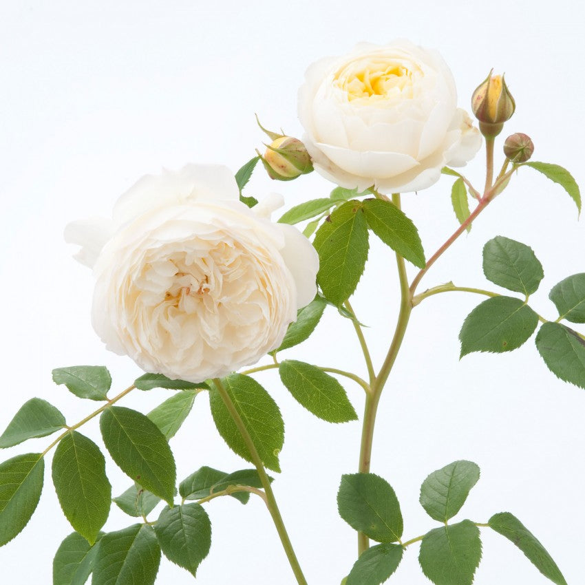 白いバラというのは、どことなく特別な感じがします~きっと純粋さと輝きのせいでしょう。 淡いレモン色のつぼみが開くと、カップ咲きになります。典型的なイングリッシュムスクと言える繊細なクリーミーホワイトのカップ咲きの花の大輪へと開いていきます。 花びらは円状に美しく並び、中心部は少しくずれた感じです。シモツケ、バニラがほんのり混じった、強いミルラの香りです。 エレガントなアーチ状のシュラブになる、ミディアムグリーンの葉がたくさん茂り、つるバラとして育てることもできます。 クレア・オースチンはデビッド・CH・オースチンの娘で、アイリス、シャクヤク、ヘメロカリスを専門にしたナーサリーを経営しています。 枝は扱いやすく、 1.5 x 1m または 2.5-3m のつるバラとしても仕立てられます。 |