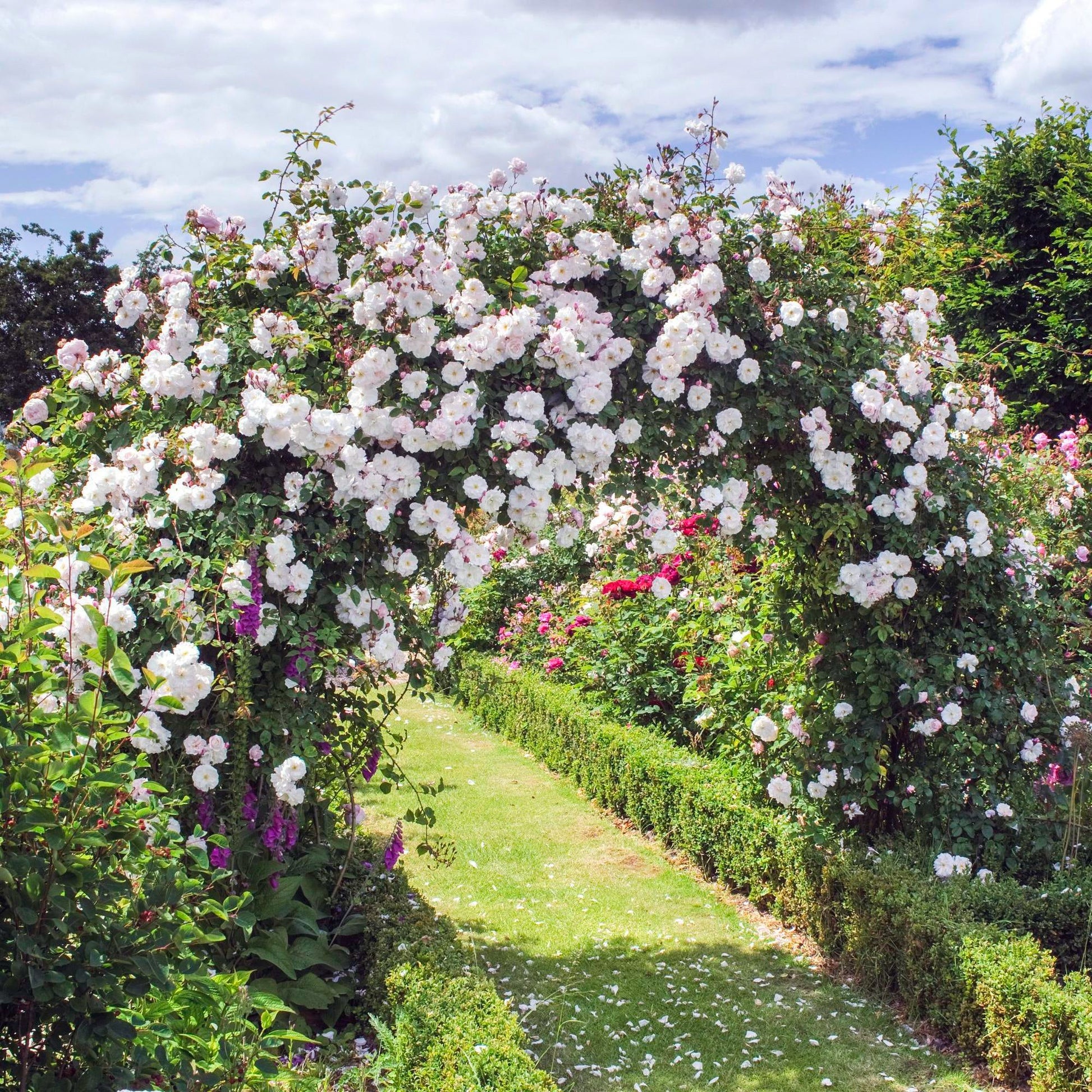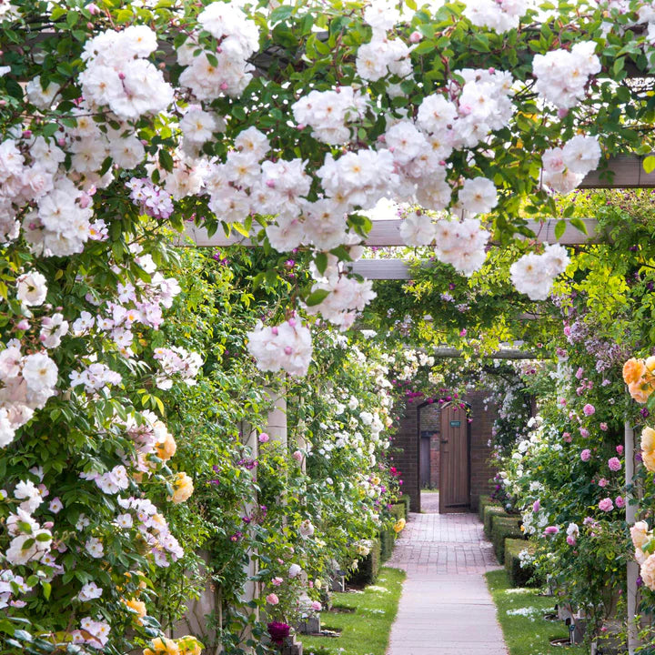 小さなクリーミーホワイトのセミダブルの花が豪華に枝にぶら下がるように咲きます。アーチや、パーゴラに向きます。ほぼ、常緑です。デリケートなサクラソウのような香り。美しく、エレガントです