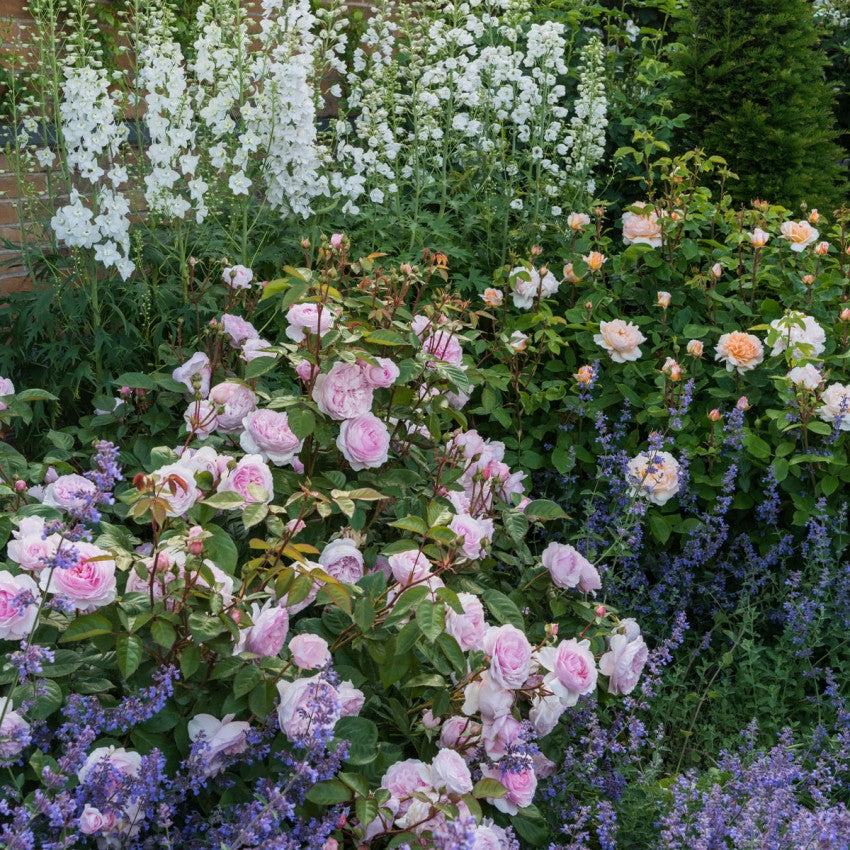 花色は均一で上品なミッドピンク。軽やかでほどよいフルーティーな香りがほのかに漂い、庭にさわやかな印象を与えます。