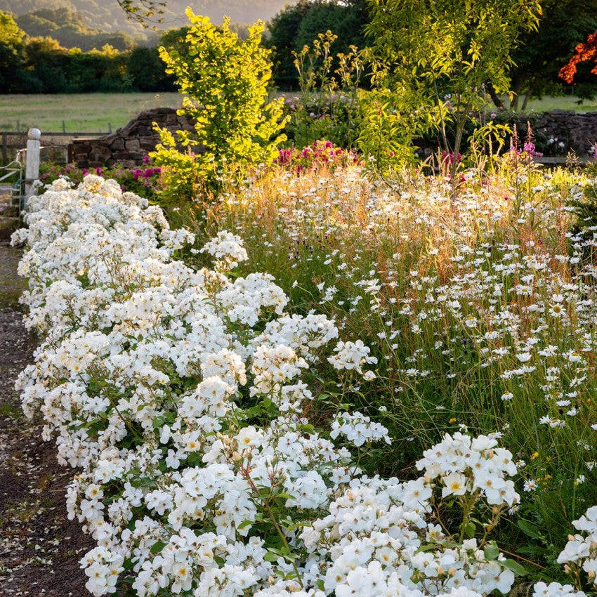 小さめの一重の花が集まって、アジサイのような大きな花のかたまりになります。ソフトアプリコット色のつぼみは、開くにつれて純白の花になり、雄しべの根元にはソフトなレモン色が混じります。花後に赤いローズヒップが付きますが、返り咲き期待する場合は花柄摘みが必要でしょう。よく茂り、まっすぐに伸び、ほとんどトゲがありません。生け垣にも、宿根草と組み合わせたミックス・ボーダーにも向いています。まとまった白花は雪に覆われたような雰囲気を醸し出します。イギリスのNIABコンテストで金賞を受賞。 ロンドンにある、キュー王立植物園の250周年記念にこの名前が付けられました。 1.5 x 1m |
