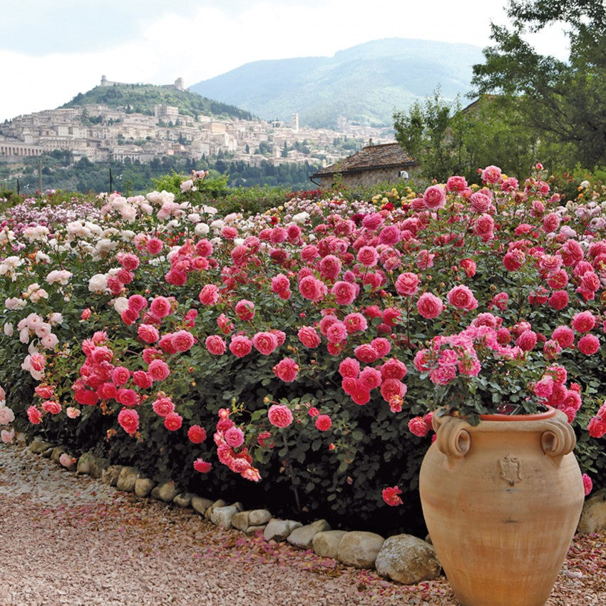 愛らしく深みのあるピンクの大輪は、ドーム型で花びらの裏側がほのかにゴールドに輝きます。ひとつひとつの花が葉の上で 優雅に咲き誇り、大輪にはめずらしく、次から次へと花を咲かせます。丈夫で病気になりにくく、勢い旺盛なシュラブです。咲き始めの頃の香りは紛れもないレモン、そしてだんだん採れたてのレモンとラズベリーを感じさせるフルーティーな香りへと変化します。スコットランドのグラスゴーで行われた香りのコンテストで優勝、一般の人気投票でも一位に選ばれました。 エリザベス女王の即位50周年であるゴールデンジュビリーの記念に生まれたこのバラは私たちの誇りです。 1 x 1m |