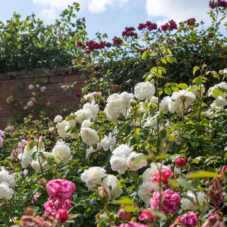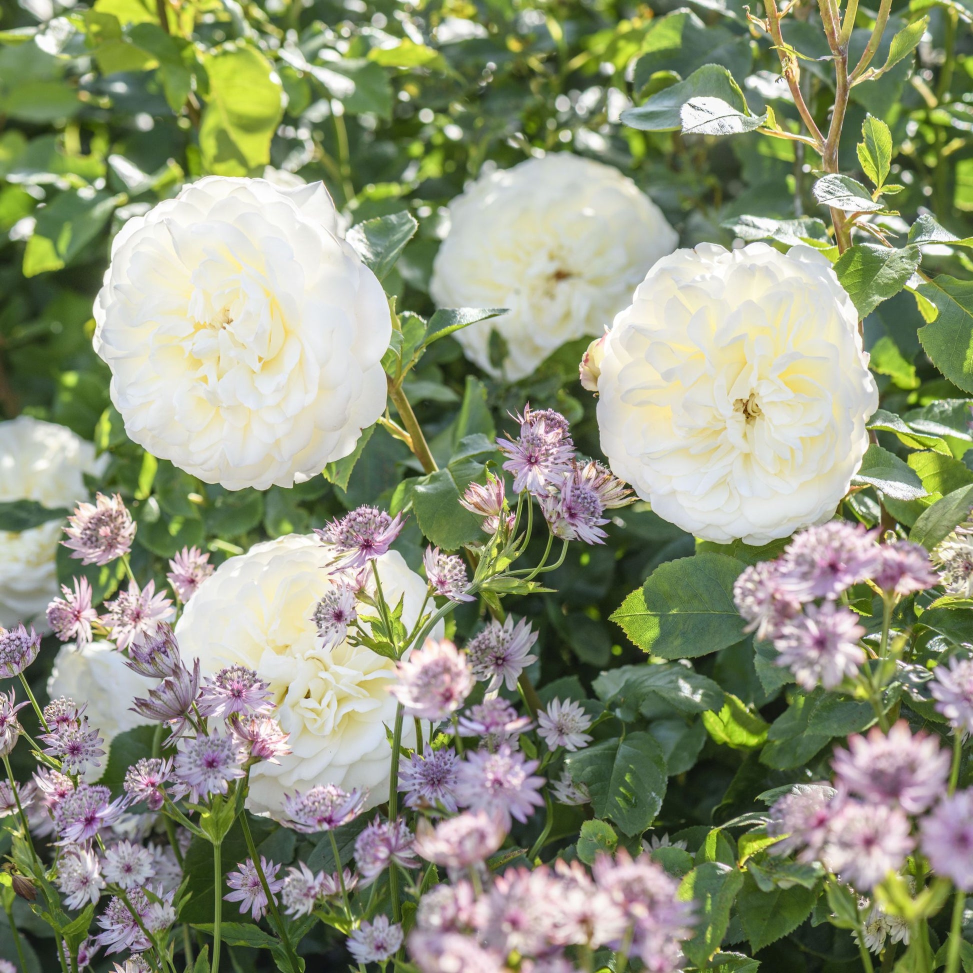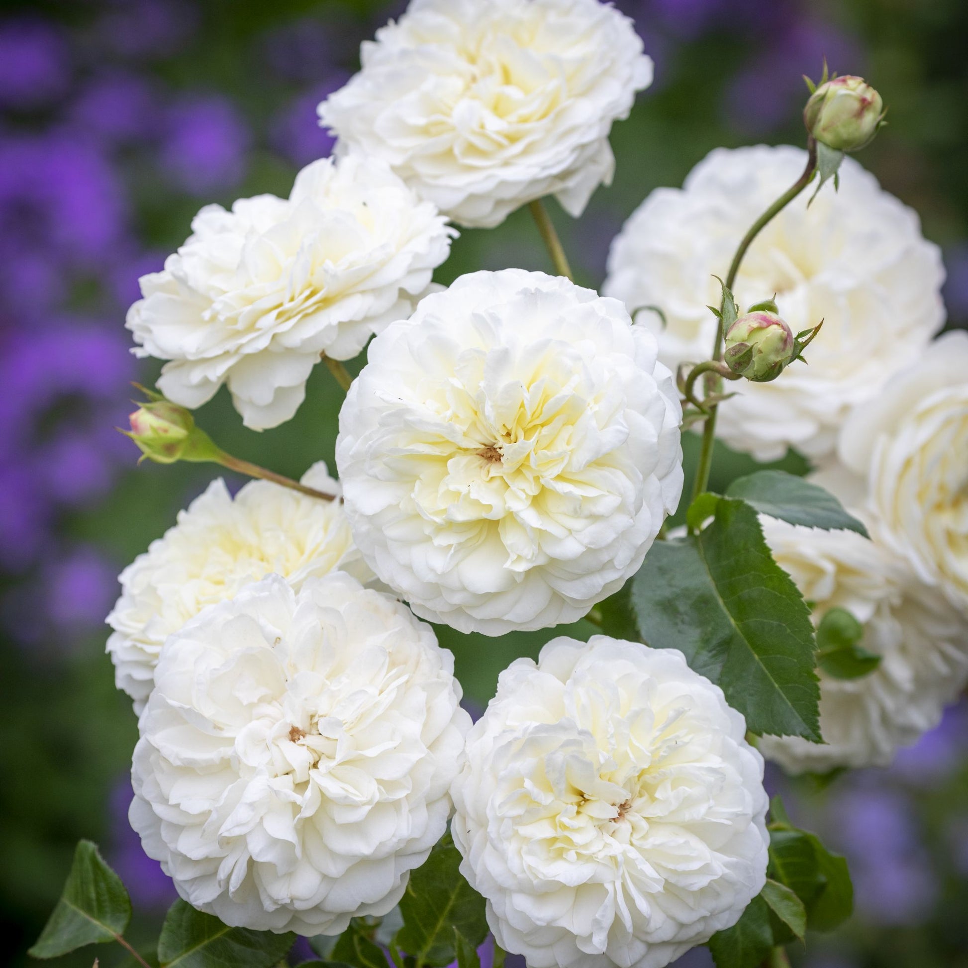 イングリッシュ・ムスクローズは、花の美しさで有名で、「トランクウィリティー」はその代表格です。丸い花びらはきれいに並び、理想的なロゼット咲きです。開いたつぼみは少し黄色がかっていて、花が開くにつれて純白に変化します。軽やかなリンゴの香りがします。まっすぐに伸び、枝先に行くに従い、外に向かってアーチ状になります。庭植えに適しているので、お好みにより、花だん用のローズとして育てることができます。活力にあふれた、とても丈夫なバラです。典型的なやさしいムスクローズの葉を持ち、あまりトゲがありません。純白の花びらがこの名前に負けないバラになるでしょう。 1.25 x 1m |
